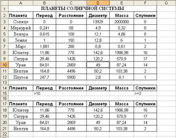 В современных табличных процессорах реализованы некоторые возможности реляционной СУБД, в частности фильтрация данных. Под фильтрацией данных будем понимать отбор данных (строк) из таблицы, удовлетворяющих условиям отбора. Фильтрация данных является аналогом запросов на выборку, которые используются для поиска информации в реляционных базах данных. В табличном процессоре Microsoft Excel существуют два способа фильтрации данных: