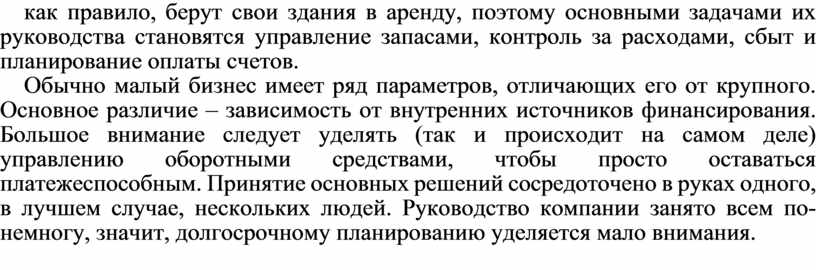 Обычно малый бизнес имеет ряд параметров, отличающих его от крупного. Основное различие – зависимость от внутренних источников финансирования. Большое внимание следует уделять (так и происходит на самом деле) управлению оборотными средствами, чтобы просто оставаться платежеспособным. Принятие основных решений сосредоточено в руках одного, в лучшем случае, нескольких людей. Руководство компании занято всем понемногу, значит, долгосрочному планированию уделяется мало внимания.