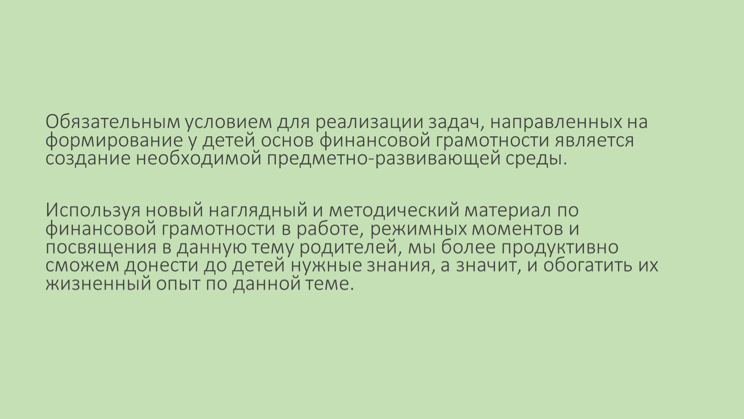 Обязательным условием для реализации задач, направленных на формирование у детей основ финансовой грамотности является создание необходимой предметно-развивающей среды.