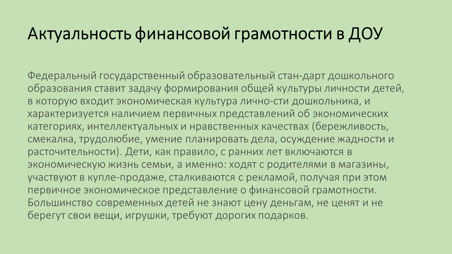 Федеральный государственный образовательный стан-дарт дошкольного образования ставит задачу формирования общей культуры личности детей, в которую входит экономическая культура лично-сти дошкольника, и характеризуется наличием первичных представлений об экономических категориях, интеллектуальных и нравственных качествах (бережливость, смекалка, трудолюбие, умение планировать дела, осуждение жадности и расточительности). Дети, как правило, с ранних лет включаются в экономическую жизнь семьи, а именно: ходят с родителями в магазины, участвуют в купле-продаже, сталкиваются с рекламой, получая при этом первичное экономическое представление о финансовой грамотности. Большинство современных детей не знают цену деньгам, не ценят и не берегут свои вещи, игрушки, требуют дорогих подарков.
