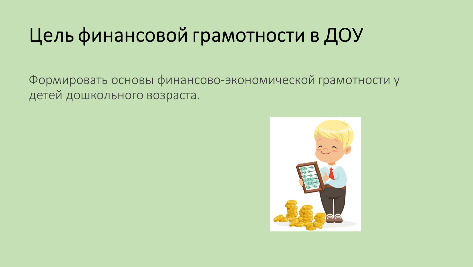 Формировать основы финансово-экономической грамотности у детей дошкольного возраста.