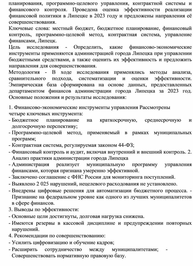 Методология - В ходе исследования применялись методы анализа, сравнительного подхода, систематизации и оценки эффективности. Эмпирическая база сформирована на основе данных, предоставленных департаментом финансов администрации города Липецка за 2023 год. Основные положения и результаты исследования: