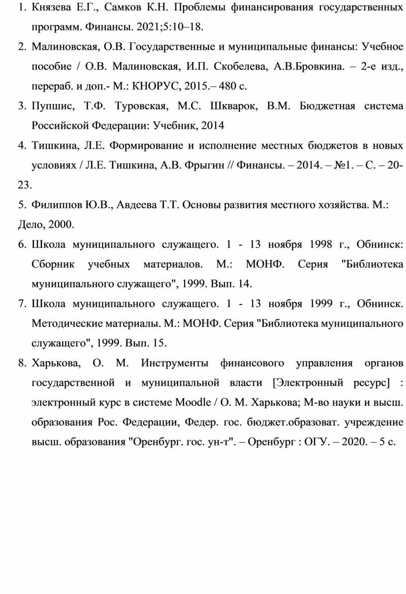 12. Харькова, О. М. Инструменты финансового управления органов государственной и муниципальной власти [Электронный ресурс] : электронный курс в системе Moodle / О. М. Харькова; М-во науки и высш. образования Рос. Федерации, Федер. гос. бюджет.образоват. учреждение высш. образования "Оренбург. гос. ун-т". – Оренбург : ОГУ. – 2020. – 5 с.