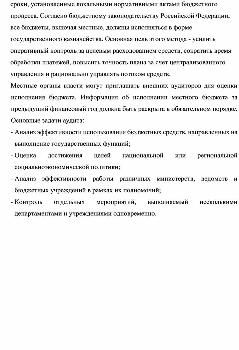Контроль за исполнением муниципального бюджета государственными органами включает в себя надзор за своевременным принятием бюджета, соблюдением процедур, предусмотренных законом, и правильным включением обязательных расходов и траты на осуществление полномочий, предоставленных государством. Муниципальное правительство предоставляет информацию о ходе исполнения бюджета представительным органам не реже одного раза в квартал. Муниципальное контрольное агентство следит за соблюдением всех бюджетных требований, и в случае выявления нарушений оно будет отчитываться перед представительным органом. Годовой отчет об исполнении бюджета представляется административным органом для утверждения представительным органом в сроки, установленные локальными нормативными актами бюджетного процесса. Согласно бюджетному законодательству Российской Федерации, все бюджеты, включая местные, должны исполняться в форме государственного казначейства. Основная цель этого метода - усилить оперативный контроль за целевым расходованием средств, сократить время обработки платежей, повысить точность плана за счет централизованного управления и рационально управлять потоком средств.