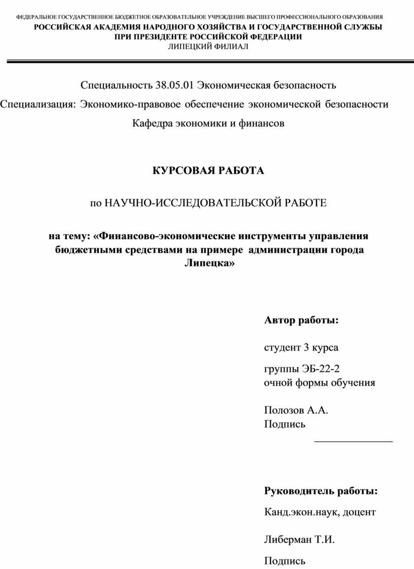 Российская академия народного хозяйства и государственной службы при Президенте Российской Федерации, Липецкий филиал, г Липецк Научный руководитель – Либерман Т.И., канд. экон. наук, доц.