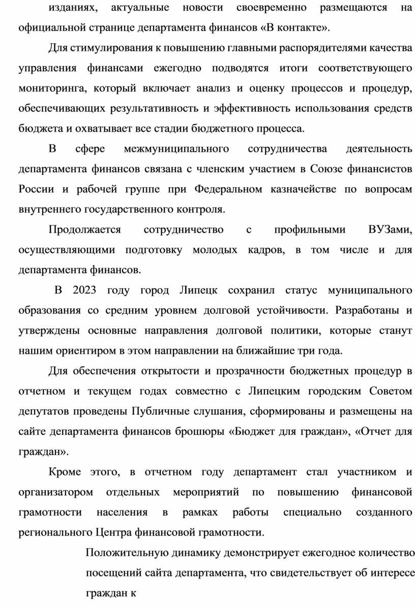 Для обеспечения открытости и прозрачности бюджетных процедур в отчетном и текущем годах совместно с Липецким городским Советом депутатов проведены Публичные слушания, сформированы и размещены на сайте департамента финансов брошюры «Бюджет для граждан», «Отчет для граждан».