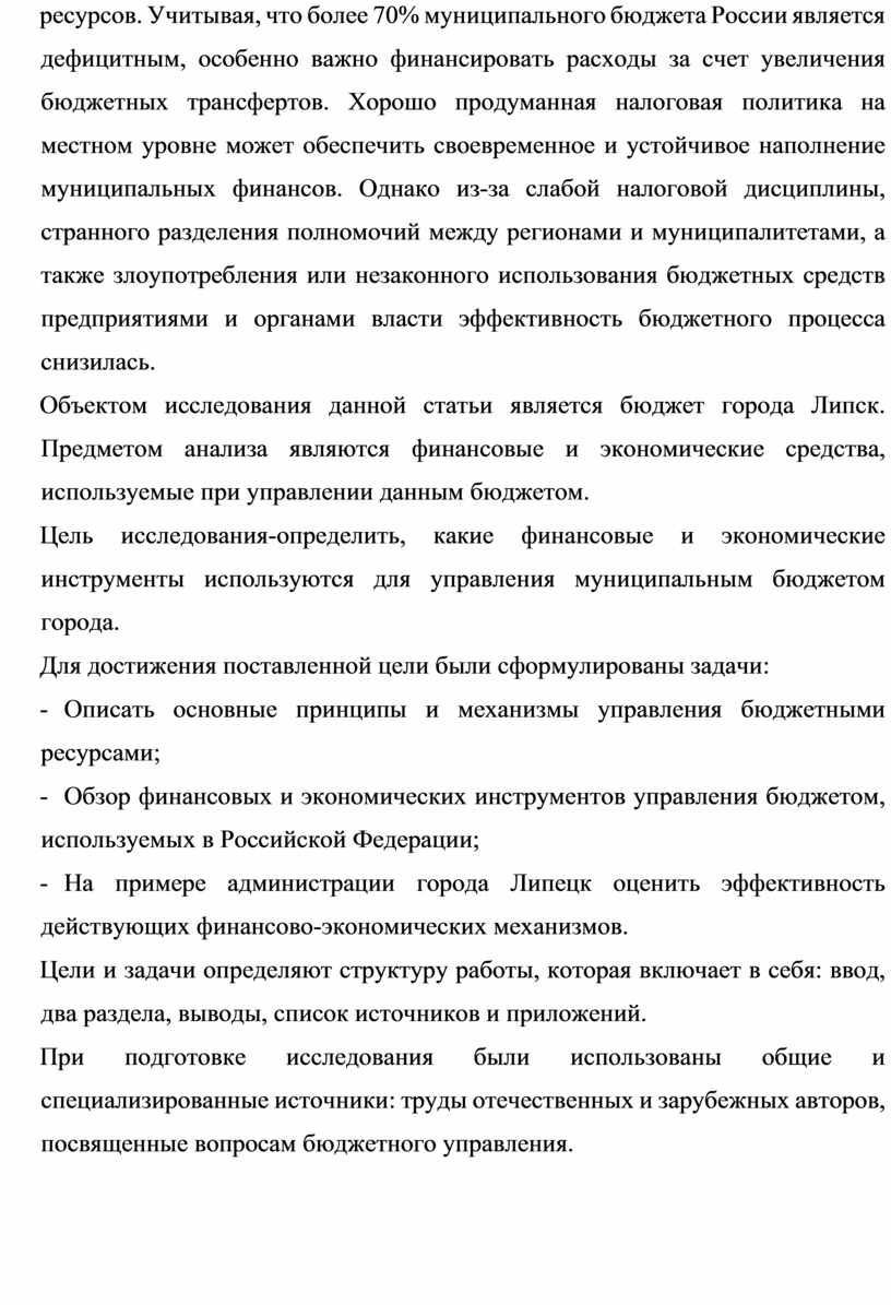 Цель исследования-определить, какие финансовые и экономические инструменты используются для управления муниципальным бюджетом города.