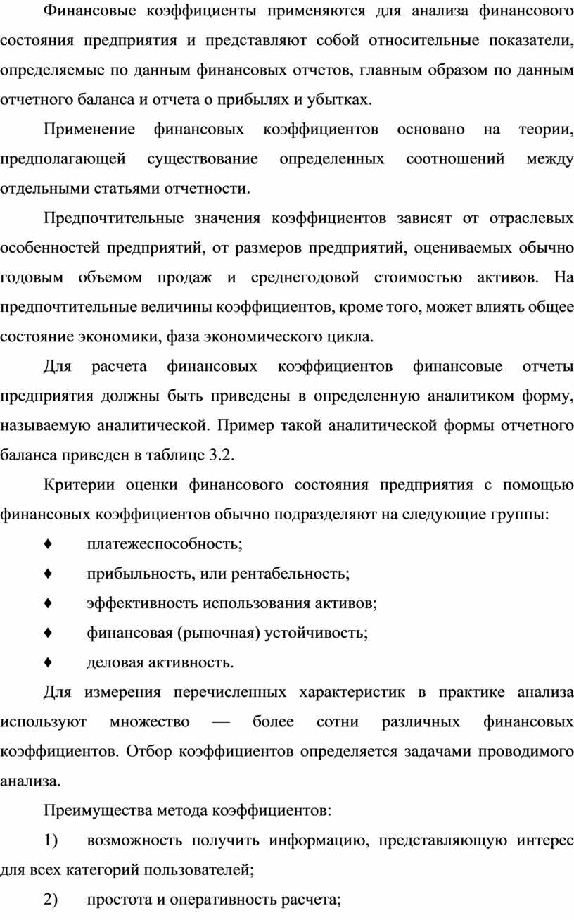 Для расчета финансовых коэффициентов финансовые отчеты предприятия должны быть приведены в определенную аналитиком форму, называемую аналитической. Пример такой аналитической формы отчетного баланса приведен в таблице 3.2.