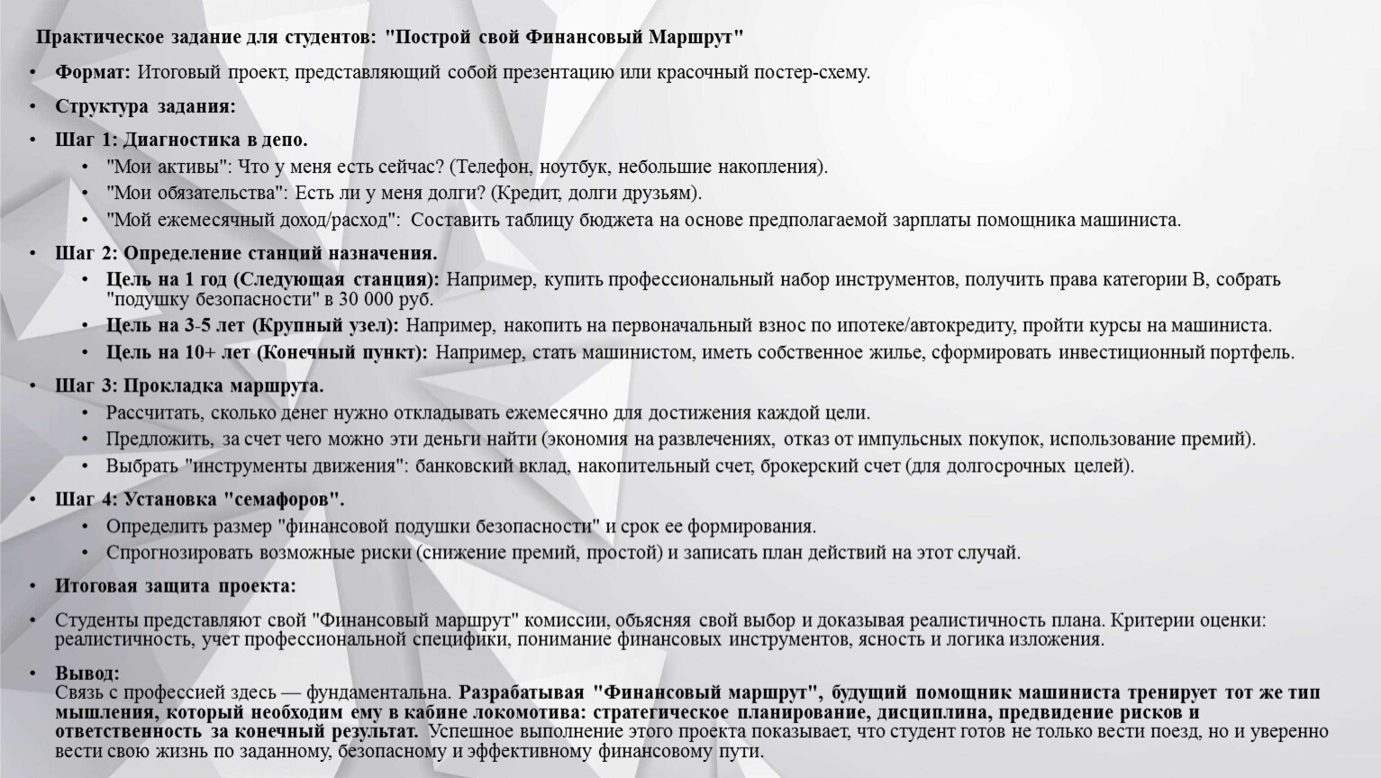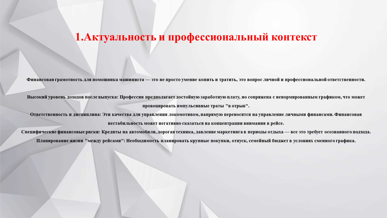 1.Актуальность и профессиональный контекстФинансовая грамотность для помощника машиниста — это не просто умение копить и тратить, это вопрос личной и профессиональной ответственности. Высокий уровень доходов после выпуска: Профессия предполагает достойную заработную плату, но сопряжена с ненормированным графиком, что может провоцировать импульсивные траты "в отрыв".Ответственность и дисциплина: Эти качества для управления локомотивом, напрямую переносятся на управление личными финансами. Финансовая нестабильность может негативно сказаться на концентрации внимания в рейсе.Специфические финансовые риски: Кредиты на автомобили, дорогая техника, давление маркетинга в периоды отдыха — все это требует осознанного подхода.Планирование жизни "между рейсами": Необходимость планировать крупные покупки, отпуск, семейный бюджет в условиях сменного графика.