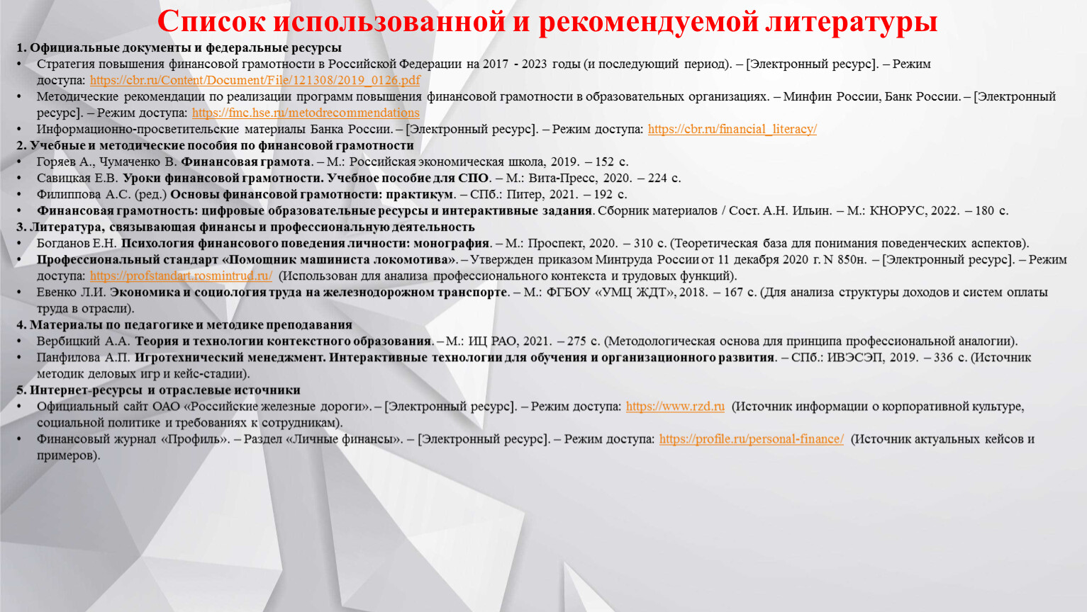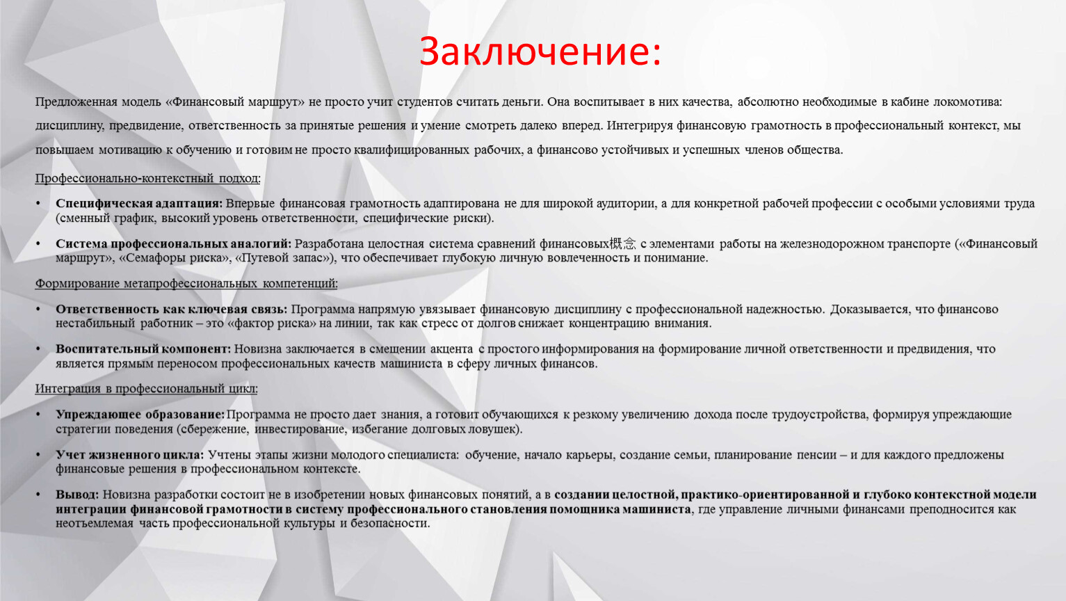 Вывод: Новизна разработки состоит не в изобретении новых финансовых понятий, а в создании целостной, практико-ориентированной и глубоко контекстной модели интеграции финансовой грамотности в систему профессионального становления помощника машиниста, где управление личными финансами преподносится как неотъемлемая часть профессиональной культуры и безопасности.