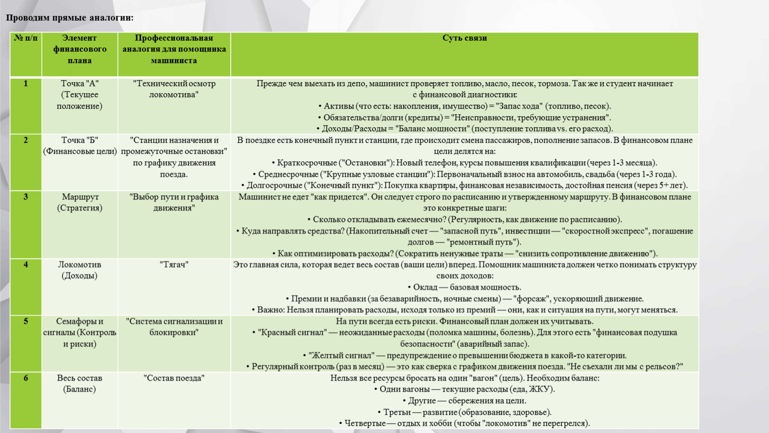 № п/п | Элемент финансового плана | Профессиональная аналогия для помощника машиниста | Суть связи |