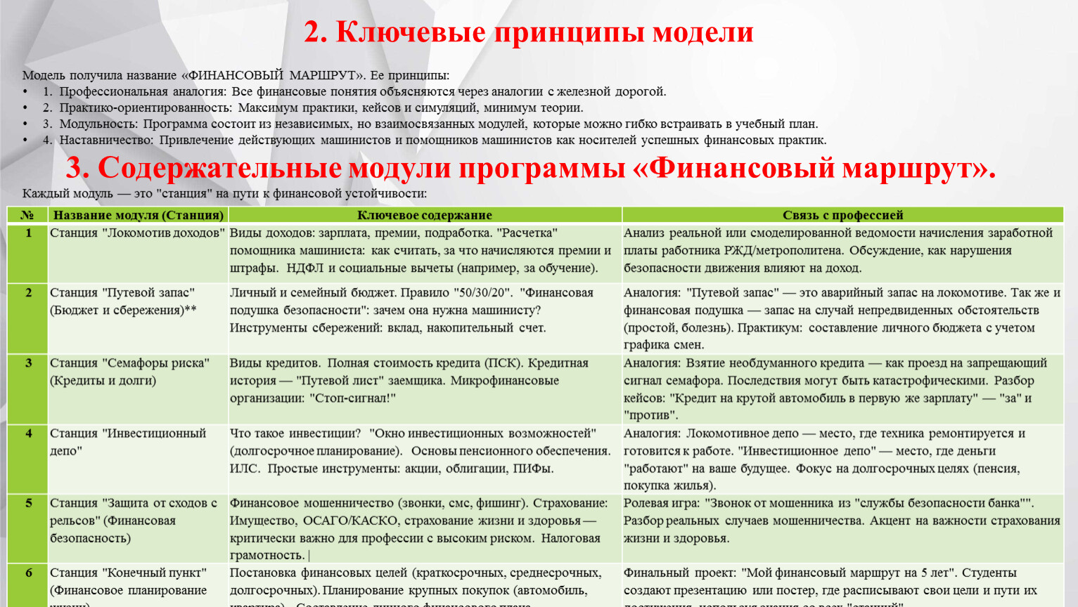 Система профессиональных аналогий: Разработана целостная система сравнений финансовых概念 с элементами работы на железнодорожном транспорте («Финансовый маршрут», «Семафоры риска», «Путевой запас»), что обеспечивает глубокую личную вовлеченность и понимание.