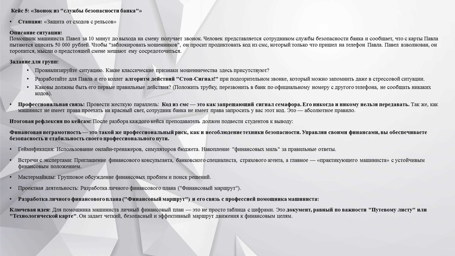 5 | Станция "Защита от сходов с рельсов" (Финансовая безопасность) | Финансовое мошенничество (звонки, смс, фишинг). Страхование: Имущество, ОСАГО/КАСКО, страхование жизни и здоровья — критически важно для профессии с высоким риском. Налоговая грамотность. | | Ролевая игра: "Звонок от мошенника из "службы безопасности банка"". Разбор реальных случаев мошенничества. Акцент на важности страхования жизни и здоровья. |