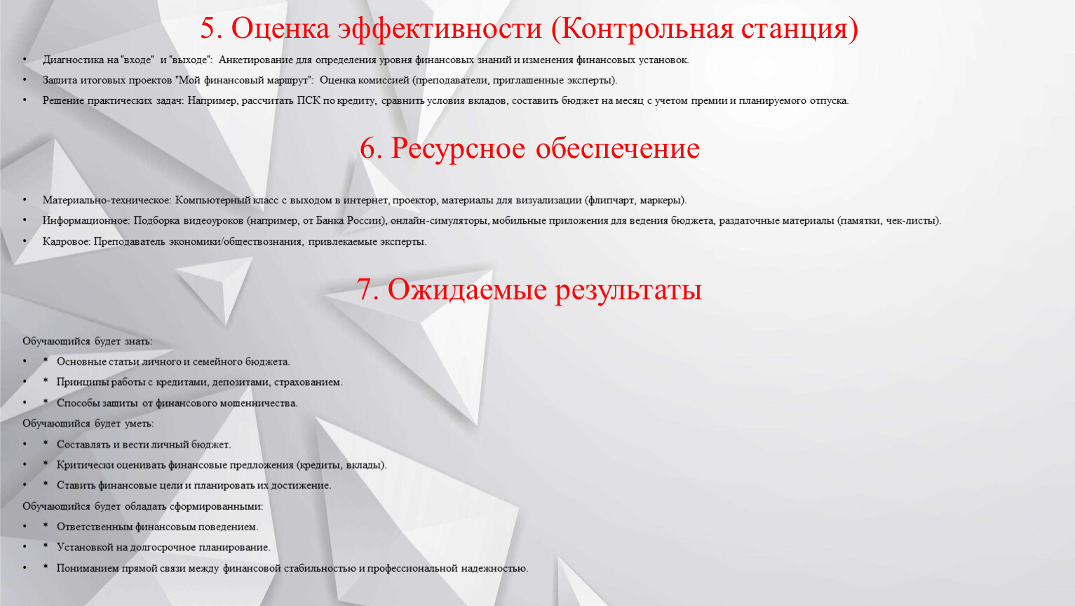 6 | Станция "Конечный пункт" (Финансовое планирование жизни) | Постановка финансовых целей (краткосрочных, среднесрочных, долгосрочных). Планирование крупных покупок (автомобиль, квартира). Составление личного финансового плана. | Финальный проект: "Мой финансовый маршрут на 5 лет". Студенты создают презентацию или постер, где расписывают свои цели и пути их достижения, используя знания со всех "станций". |