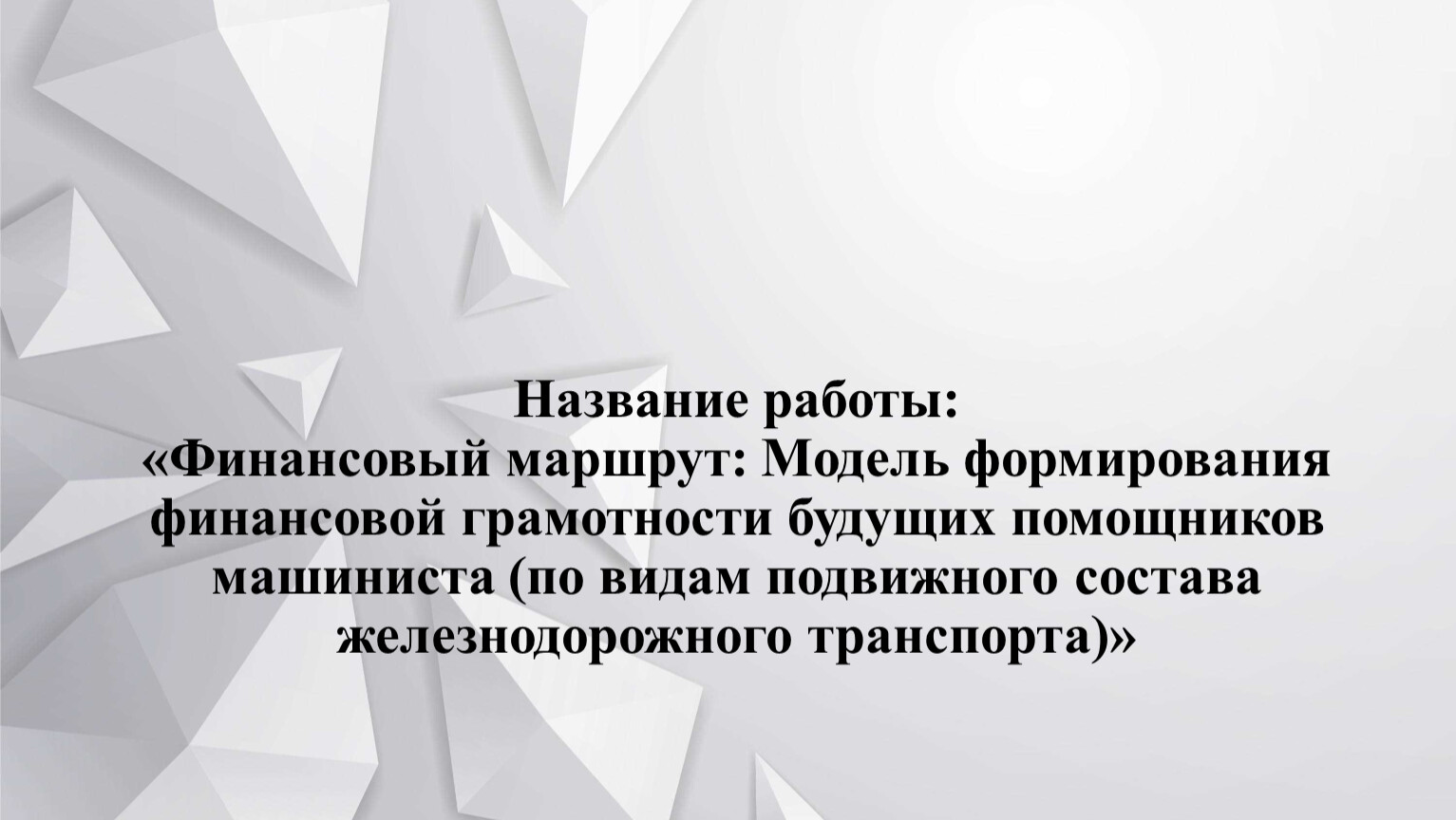 Название работы: «Финансовый маршрут: Модель формирования финансовой грамотности будущих помощников машиниста (по видам подвижного состава железнодорожного транспорта)»