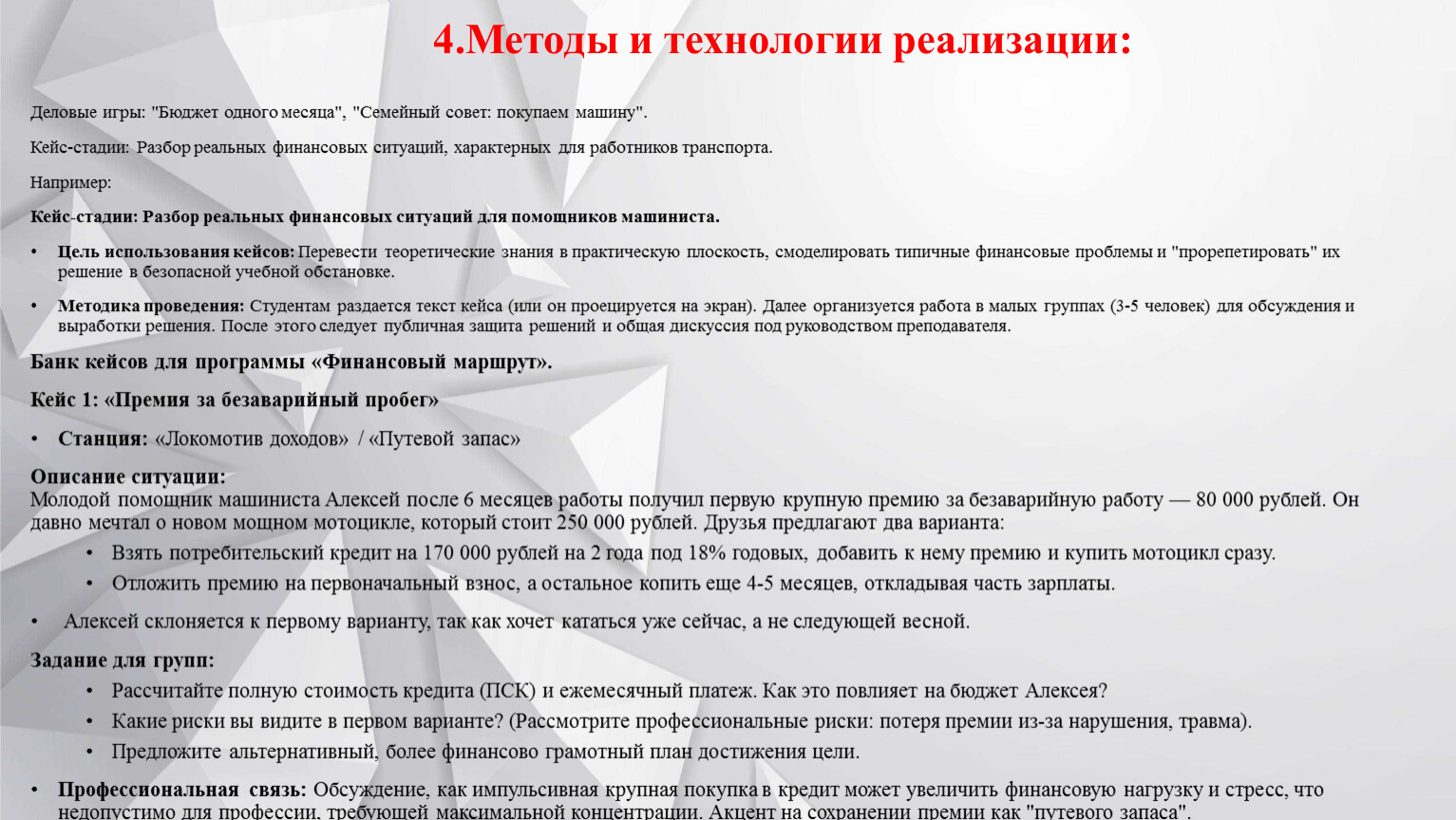Ответственность как ключевая связь: Программа напрямую увязывает финансовую дисциплину с профессиональной надежностью. Доказывается, что финансово нестабильный работник – это «фактор риска» на линии, так как стресс от долгов снижает концентрацию внимания.