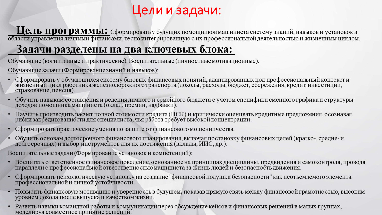 Цель программы: Сформировать у будущих помощников машиниста систему знаний, навыков и установок в области управления личными финансами, тесно интегрированную с их профессиональной деятельностью и жизненным циклом.