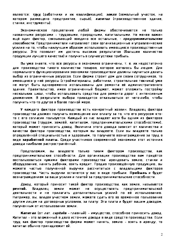 ресурсов (факторов производства) в товары и услуги. Факторами производстваявляются: труд (работники и их квалификация), земля (земельный участок, на