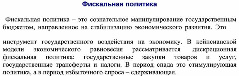 инструмент государственного воздействия на экономику. В кейнсианской модели экономического равновесия рассматривается дискреционная фискальная политика: государственные закупки товаров и услуг, государственные трансферты и налоги. В период спада это стимулирующая политика, а в период избыточного спроса – сдерживающая.