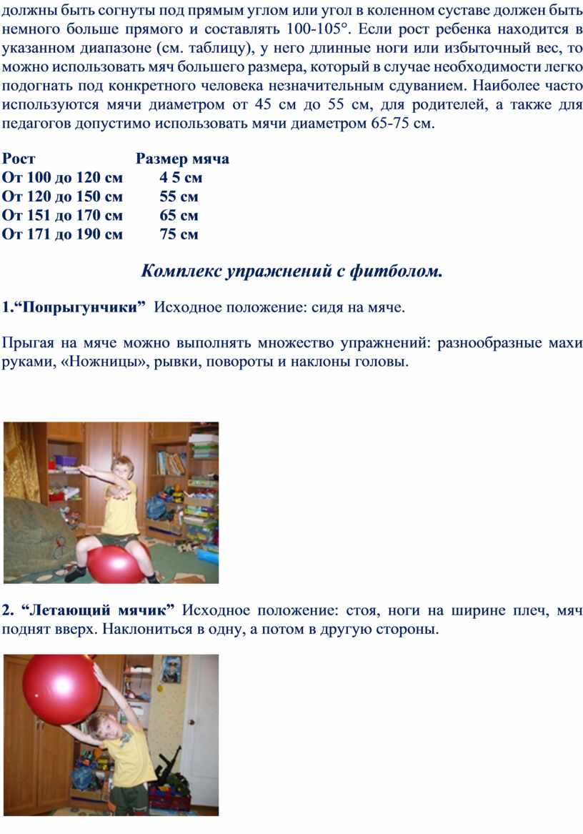 Размер подходящего гимнастического мяча определяется пропорциями тела занимающегося. В положении сидя на мяче тазобедренные и коленные суставы должны быть согнуты под прямым углом или угол в коленном суставе должен быть немного больше прямого и составлять 100-105°. Если рост ребенка находится в указанном диапазоне (см. таблицу), у него длинные ноги или избыточный вес, то можно использовать мяч большего размера, который в случае необходимости легко подогнать под конкретного человека незначительным сдуванием. Наиболее часто используются мячи диаметром от 45 см до 55 см, для родителей, а также для педагогов допустимо использовать мячи диаметром 65-75 см.