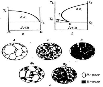 Рис.11.2 Эвтектическая диаграмма состояния : а-кривые охлаждения, отвечающие разным фигуративным точкам; b,с,d-вид диаграммы состояния ;e-микроскопическая картина шлифов составов, отвечающих фигуративным точкам на рис. а и b