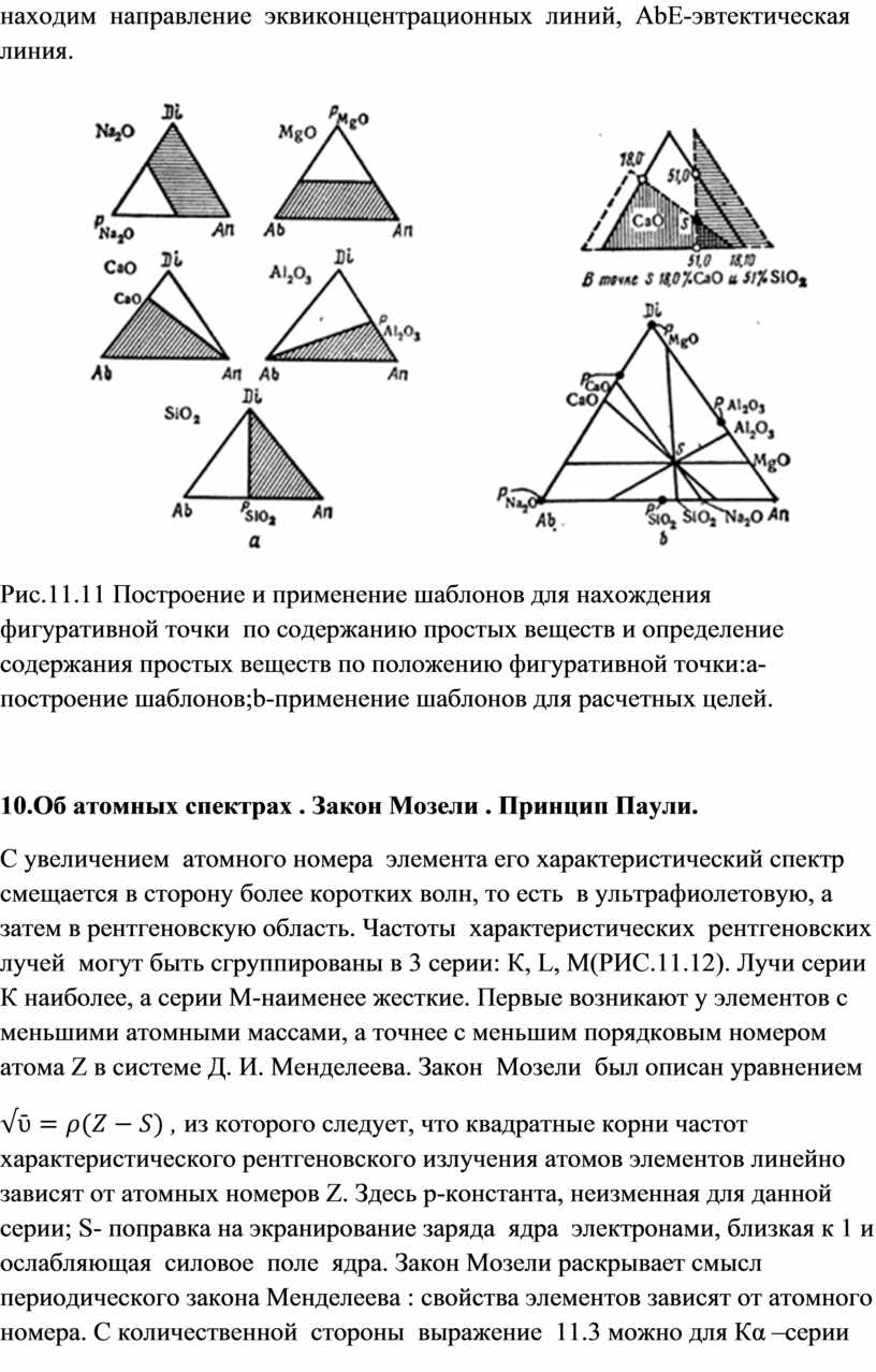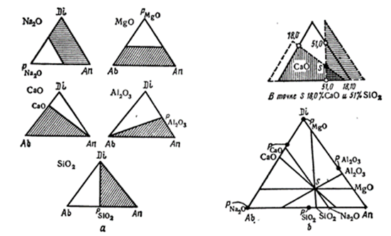 Концентрация любого простого оксида может быть представлена эквипотенциальными прямыми, которые для каждого оксида проходят под определенными углами к сторонам диаграммы (рис.11.10,b). Отложив на сторонах последней концентрационный масштаб и используя шаблоны, стороны которых направлены под углами, отвечающими эквипотенциальным линиям(рис.11.11, а), можно без всякого расчета найти по положению точки ее состав в простых оксидах . По химическому составу же можно найти сразу фигуративную точку(рис.11.11, б). Для этой цели нужно знать содержание некоторых (например двух или трех) простых оксидов , ибо в идеальном случае все прямые должны пересечься в одной точке S .Можно непосредственно связать химический и фазовый состав с ходом температур плавления, механических, оптических, электрических, и магнитных свойств фигуративных точек , значительно сократить количество аналитических определений.