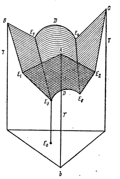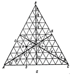 Тройная система A-B-C построена в виде треугольной диаграммы Гиббса (симметричная) или несимметричными диаграммами Ормонта. В первом случае чтобы определить состав фигуративной точки Ф опущены перпендикуляры к сторонам диаграммы(рис.1.9,a).Высота таких перпендикуляров в долях высоты треугольника показывает концентрацию компонента , символ которого помещен в противоположной вершине треугольника. Значение свойства задается двумя способами: высотой перпендикуляра (например Е0 Е5 на рис.11.9 b)к данной точке; совокупность вершин перпендикуляров образует поверхность представляющую зависимость состав – свойство в данной тройной системе или , 2)кривыми , отражающими на диаграмме геометрические места точек с равными свойствами . На рис.11.9, с показана диаграмма плавкости системы Вi-Рb-Sn, построенная по способу 2.