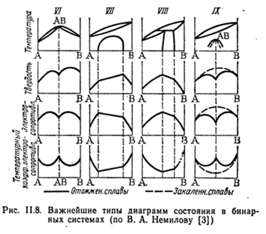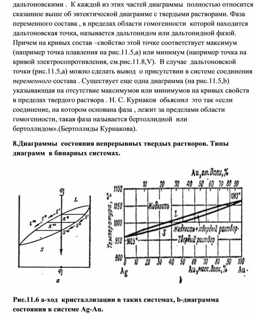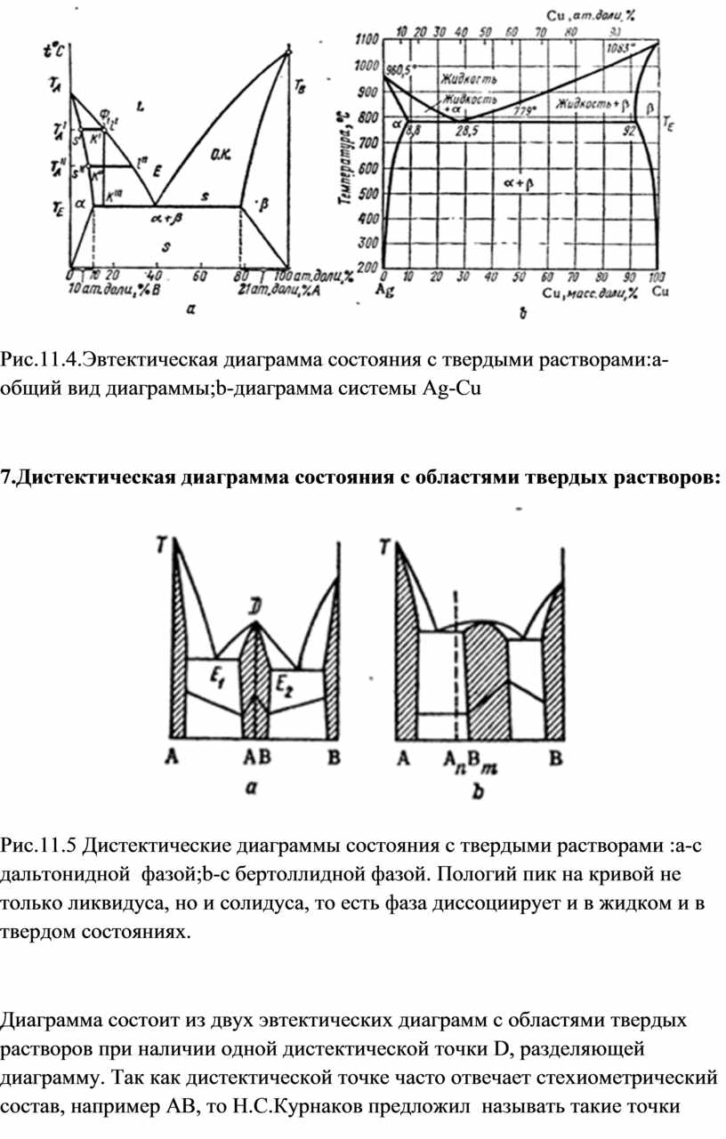 Диаграмма состоит из двух эвтектических диаграмм с областями твердых растворов при наличии одной дистектической точки D, разделяющей диаграмму. Так как дистектической точке часто отвечает стехиометрический состав, например АВ, то Н.С.Курнаков предложил называть такие точки дальтоновскими . К каждой из этих частей диаграммы полностью относится сказанное выше об эвтектической диаграмме с твердыми растворами. Фаза переменного состава , в пределах области гомогенности которой находится дальтоновская точка, называется дальтонидом или дальтонидной фазой. Причем на кривых состав –свойство этой точке соответствует максимум (например точка плавления на рис.11.5,а) или минимум (например точка на кривой электросопротивления, см.рис.11.8,V). В случае дальтоновской точки (рис.11.5,a) можно сделать вывод о присутствии в системе соединения переменного состава . Существует еще одна диаграмма (на рис.11.5,b) указывающая на отсутствие максимумов или минимумов на кривых свойств в пределах твердого раствора . Н. С. Курнаков обьяснил это так «если соединение, на котором основана фаза , лежит за пределами области гомогенности, такая фаза называется бертоллидной или бертоллидом».(Бертоллиды Курнакова).