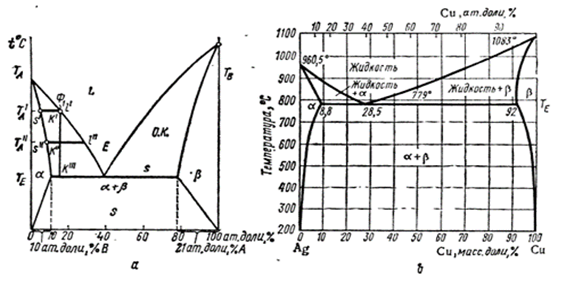 Рис.11.4.Эвтектическая диаграмма состояния с твердыми растворами:а-общий вид диаграммы;b-диаграмма системы Ag-Cu