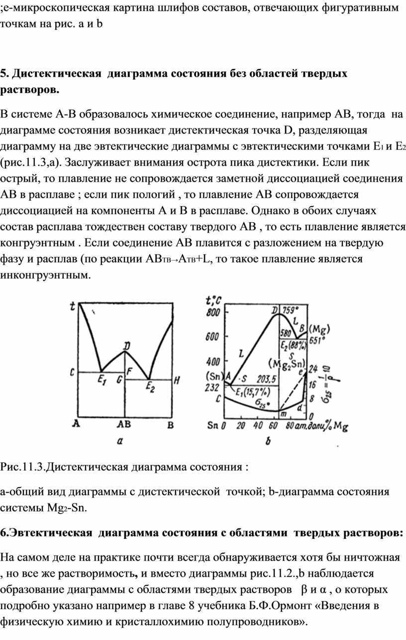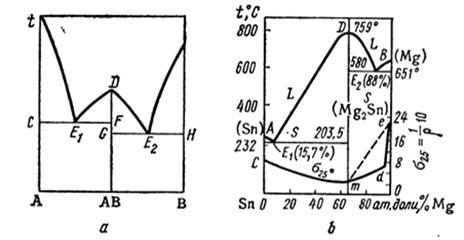 а-общий вид диаграммы с дистектической точкой; b-диаграмма состояния системы Mg2-Sn.