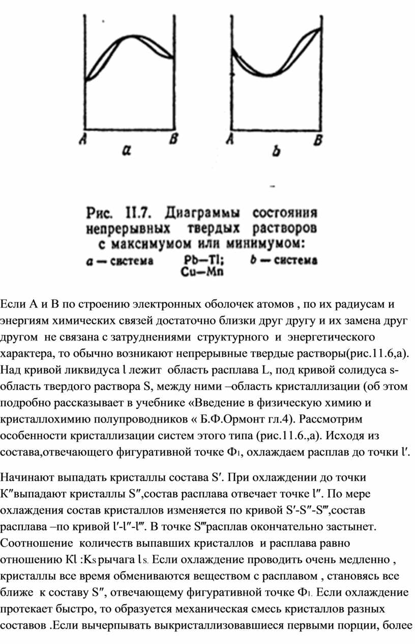 Если А и В по строению электронных оболочек атомов , по их радиусам и энергиям химических связей достаточно близки друг другу и их замена друг другом не связана с затруднениями структурного и энергетического характера, то обычно возникают непрерывные твердые растворы(рис.11.6,а). Над кривой ликвидуса Ɩ лежит область расплава L, под кривой солидуса s-область твердого раствора S, между ними –область кристаллизации (об этом подробно рассказывает в учебнике «Введение в физическую химию и кристаллохимию полупроводников « Б.Ф.Ормонт гл.4). Рассмотрим особенности кристаллизации систем этого типа (рис.11.6.,а). Исходя из состава,отвечающего фигуративной точке Ф1, охлаждаем расплав до точки Ɩ′.