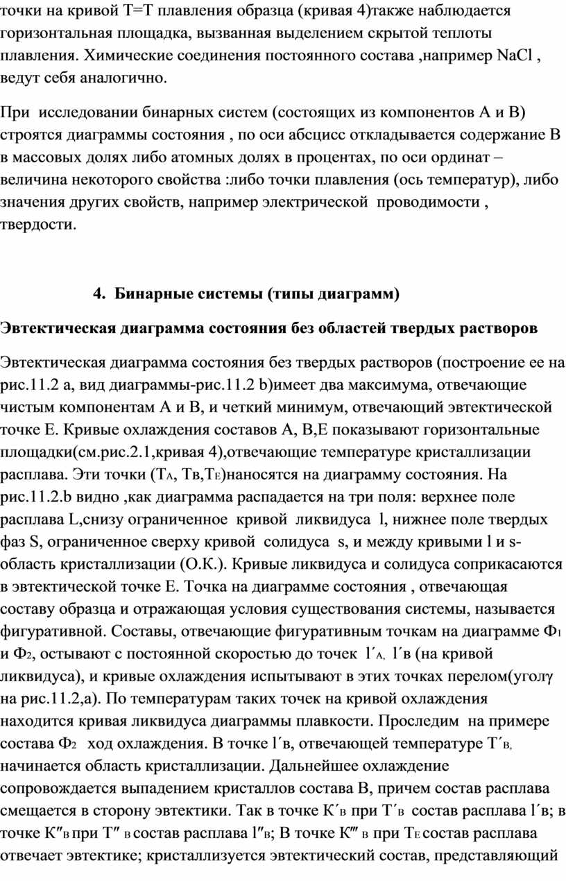 На самом деле на практике почти всегда обнаруживается хотя бы ничтожная , но все же растворимость, и вместо диаграммы рис.11.2.,b наблюдается образование диаграммы с областями твердых растворов β и α , о которых подробно указано например в главе 8 учебника Б.Ф.Ормонт «Введения в физическую химию и кристаллохимию полупроводников».