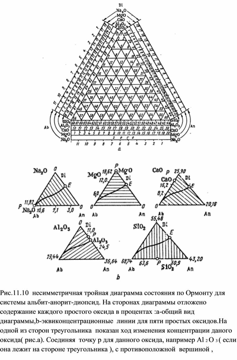 Рис.11.10 несимметричная тройная диаграмма состояния по Ормонту для системы альбит-анорит-диопсид. На сторонах диаграммы отложено содержание каждого простого оксида в процентах :a-общий вид диаграммы,b-эквиконцентрационные линии для пяти простых оксидов.На одной из сторон треугольника показан ход изменения концентрации даного оксида( рис.а). Cоединяя точку р для данного оксида, например Аl 2 O 3 ( если она лежит на стороне треугольника ), с противоположной вершиной , находим направление эквиконцентрационных линий, AbE-эвтектическая линия.