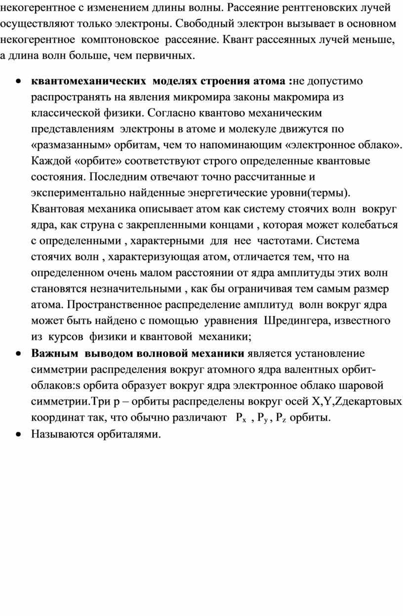 · квантомеханических моделях строения атома :не допустимо распространять на явления микромира законы макромира из классической физики. Согласно квантово механическим представлениям электроны в атоме и молекуле движутся по «размазанным» орбитам, чем то напоминающим «электронное облако». Каждой «орбите» соответствуют строго определенные квантовые состояния. Последним отвечают точно рассчитанные и экспериментально найденные энергетические уровни(термы). Квантовая механика описывает атом как систему стоячих волн вокруг ядра, как струна с закрепленными концами , которая может колебаться с определенными , характерными для нее частотами. Система стоячих волн , характеризующая атом, отличается тем, что на определенном очень малом расстоянии от ядра амплитуды этих волн становятся незначительными , как бы ограничивая тем самым размер атома. Пространственное распределение амплитуд волн вокруг ядра может быть найдено с помощью уравнения Шредингера, известного из курсов физики и квантовой механики;