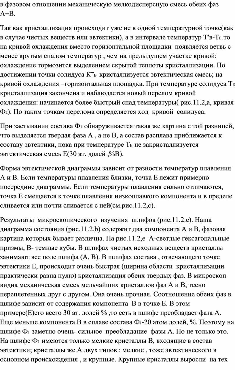 Результаты микроскопического изучения шлифов (рис.11.2.е). Наша диаграмма состояния (рис.11.2.b) содержит два компонента А и В, фазовая картина которых бывает различна. На рис.11.2,е А-светлые гексагональные призмы, В- темные кубы. В шлифах чистых исходных веществ кристаллы занимают все поле шлифа (А, В). В шлифах состава , отвечающего точке эвтектики Е, происходит очень быстрая (ширина области кристаллизации практически равна нулю) кристаллизация обеих твердых фаз. В микроскоп видна механическая смесь мельчайших кристаллов фаз А и В, тесно переплетенных друг с другом. Она очень прочная. Соотношение обеих фаз в шлифе зависит от содержания компонента В в точке Е. В этом примере(Е)его всего 30 ат. долей % ,то есть в шлифе преобладает фаза А. Еще меньше компонента В в сплаве состава Ф1-20 атом.долей, %. Поэтому на шлифе Ф1 заметно очень сильное преобладание фазы А. Но не только это. На шлифе Ф1 имеются только мелкие кристаллы В, входящие в состав эвтектики; кристаллы же А двух типов : мелкие , тоже эвтектического в основном происхождения , и крупные. Крупные кристаллы выросли на тех немногочисленных зародышах фазы А, которые выделились около точки l′A и медленно росли , пока система охлаждалась от температуры ликвидуса до температуры солидуса. По отношению размеров полей крупных кристаллов А к размерам полей эвтектики можно оценить положение точки Ф1 на диаграмме. Составу Ф2 отвечает свыше 85 ат. долей ,%,В. Поле этой фазы (шлиф Ф2) уже значительно превалирует .Имеются не только мелкие, но и крупные кристаллы В.