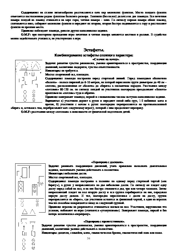 игровые эстафеты, чередуя задания на сохранение равновесия при ходьбе и прыжках с преодолением небольших
