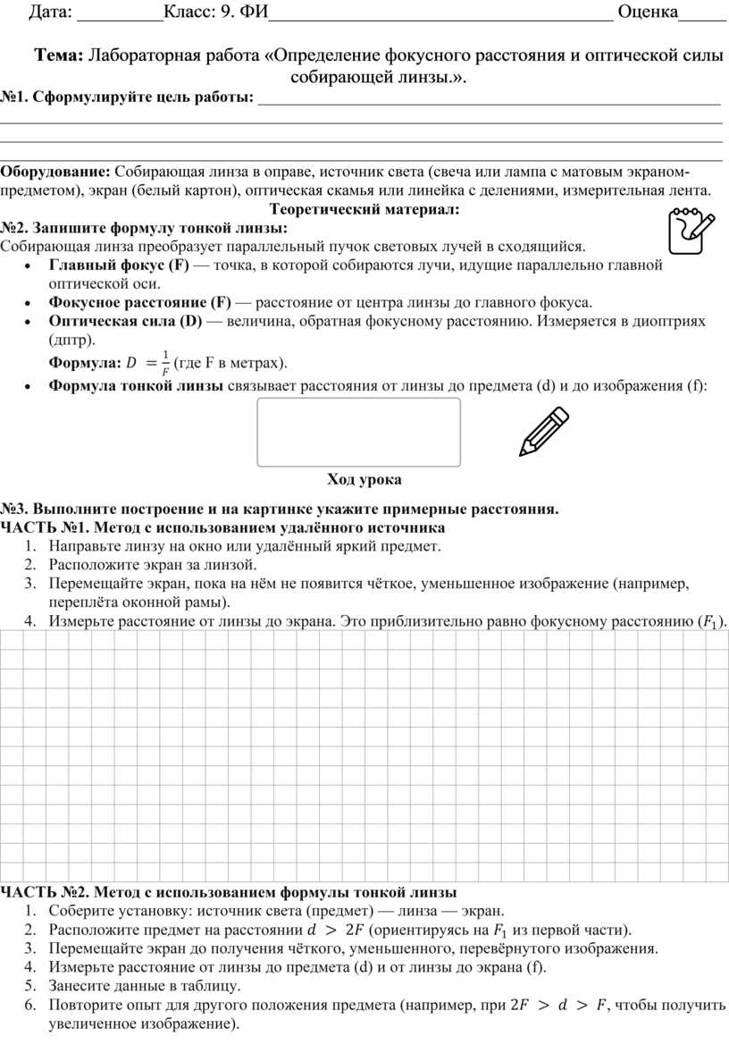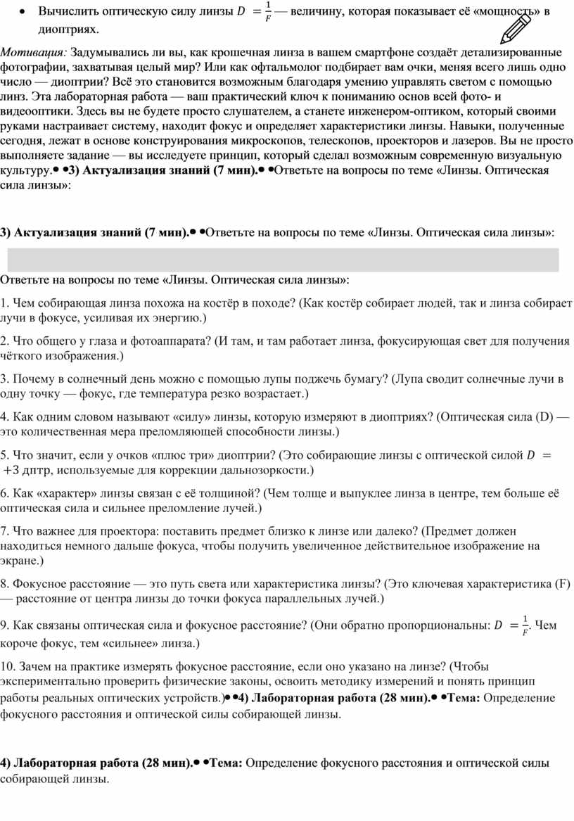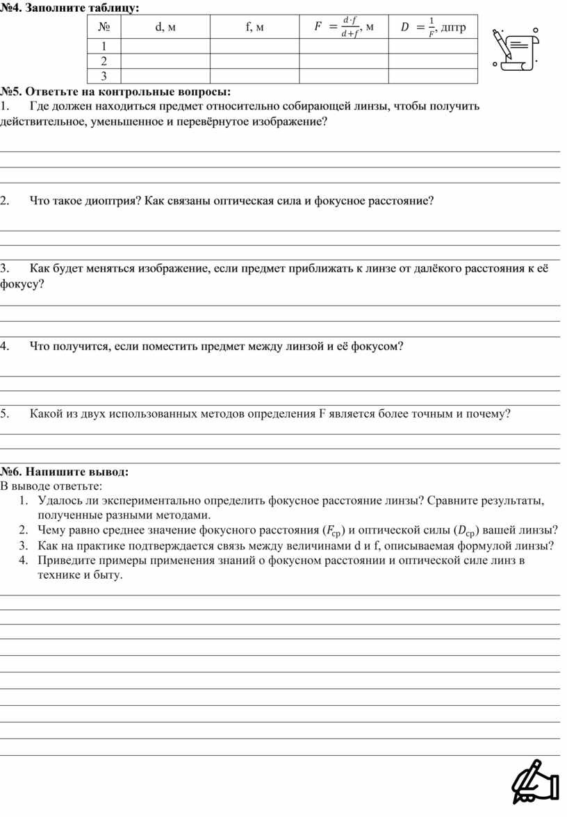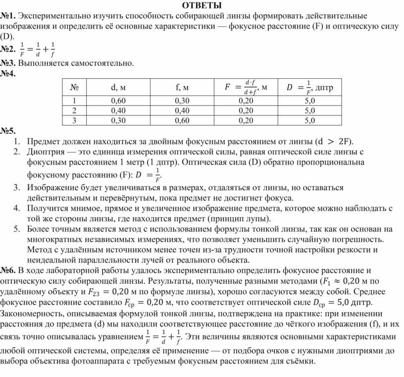 обратно пропорциональны: 10. Зачем на практике измерять фокусное расстояние, если оно указано на линзе? (Чтобы экспериментально проверить физические законы, освоить методику измерений и понять принцип работы реальных оптических устройств.) |