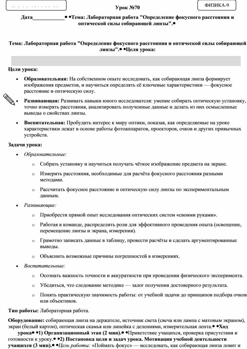 Тип работы: Лабораторная работа. Оборудование: собирающая линза на держателе, источник света (свеча или лампа с матовым экраном), экран (белый картон), оптическая скамья или линейка с делениями, измерительная лента. |