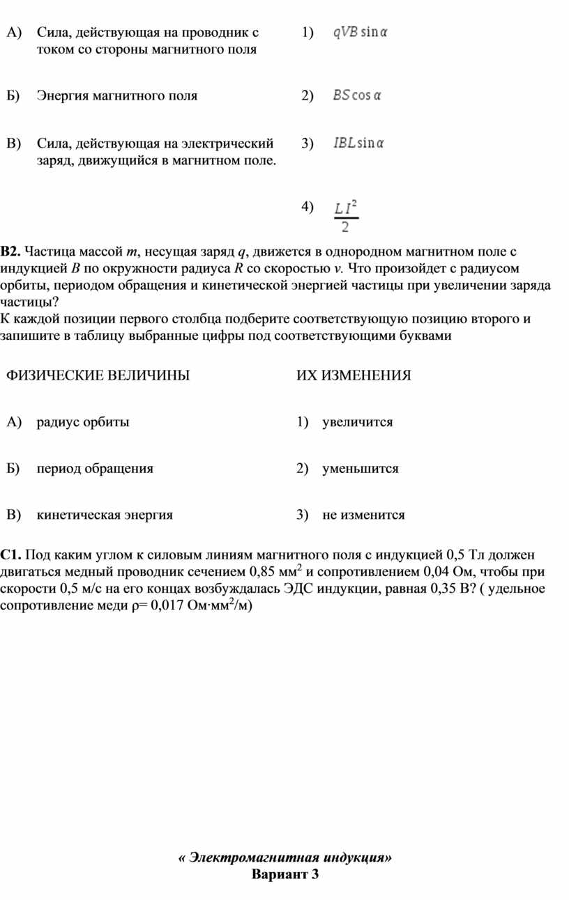В2. Частица массой m, несущая заряд q, движется в однородном магнитном поле с индукцией B по окружности радиуса R со скоростью v. Что произойдет с радиусом орбиты, периодом обращения и кинетической энергией частицы при увеличении индукции магнитного поля? К каждой позиции первого столбца подберите соответствующую позицию второго и запишите в таблицу выбранные цифры под соответствующими буквами