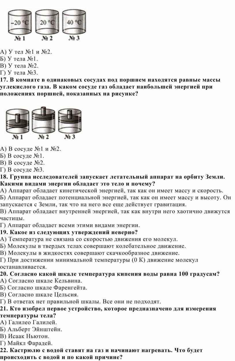 17. В комнате в одинаковых сосудах под поршнем находятся равные массы углекислого газа. В каком сосуде газ обладает наибольшей энергией при положениях поршней, показанных на рисунке?
