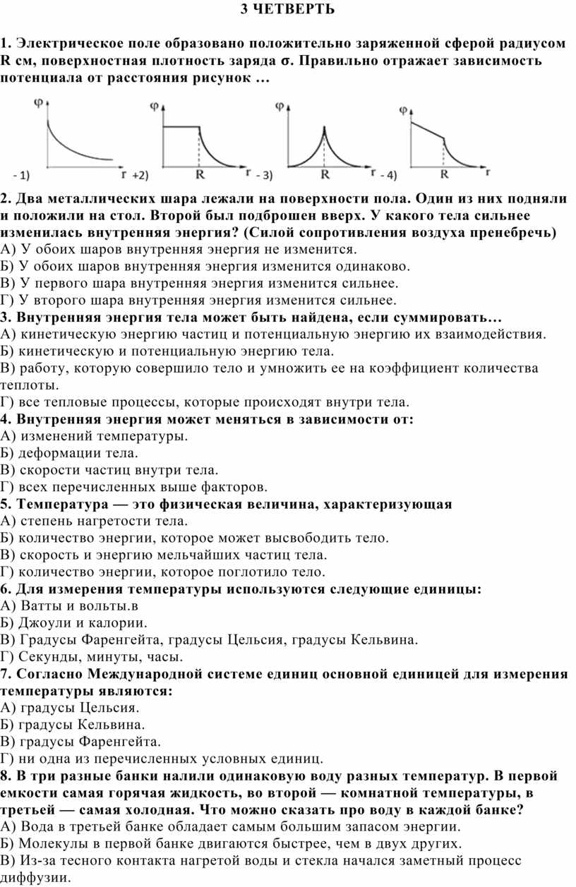 1. Электрическое поле образовано положительно заряженной сферой радиусом R см, поверхностная плотность заряда σ. Правильно отражает зависимость потенциала от расстояния рисунок …