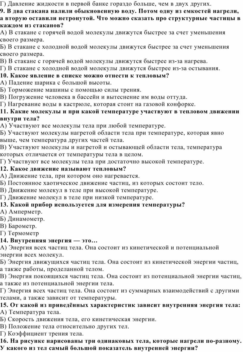 9. В два стакана налили обыкновенную воду. Потом одну из емкостей нагрели, а вторую оставили нетронутой. Что можно сказать про структурные частицы в каждом из стаканов?