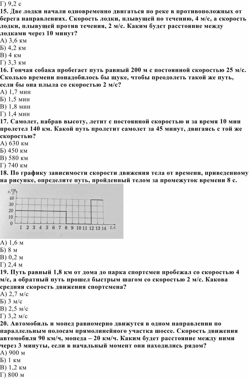 15. Две лодки начали одновременно двигаться по реке в противоположных от берега направлениях. Скорость лодки, плывущей по течению, 4 м/с, а скорость лодки, плывущей против течения, 2 м/с. Каким будет расстояние между лодками через 10 минут?
