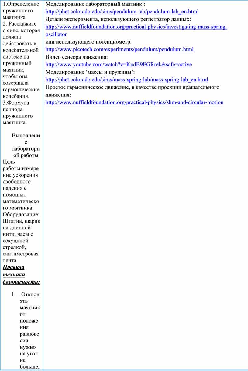 Моделирование лабораторный маятник’: http://phet.colorado.edu/sims/pendulum-lab/pendulum-lab_en.html Детали эксперимента, использующего регистратор данных: http://www.nuffieldfoundation.org/practical-physics/investigating-mass-spring-oscillator или использующего потенциометр: http://www.picotech.com/experiments/pendulum/pendulum.html Видео сенсора движения: http://www.youtube.com/watch?v=KudB9EGRrek&safe=active Моделирование ‘массы и пружины’: http://phet.colorado.edu/sims/mass-spring-lab/mass-spring-lab_en.html Простое гармоническое движение, в качестве проекции вращательного движения: http://www.nuffieldfoundation.org/practical-physics/shm-and-circular-motion |