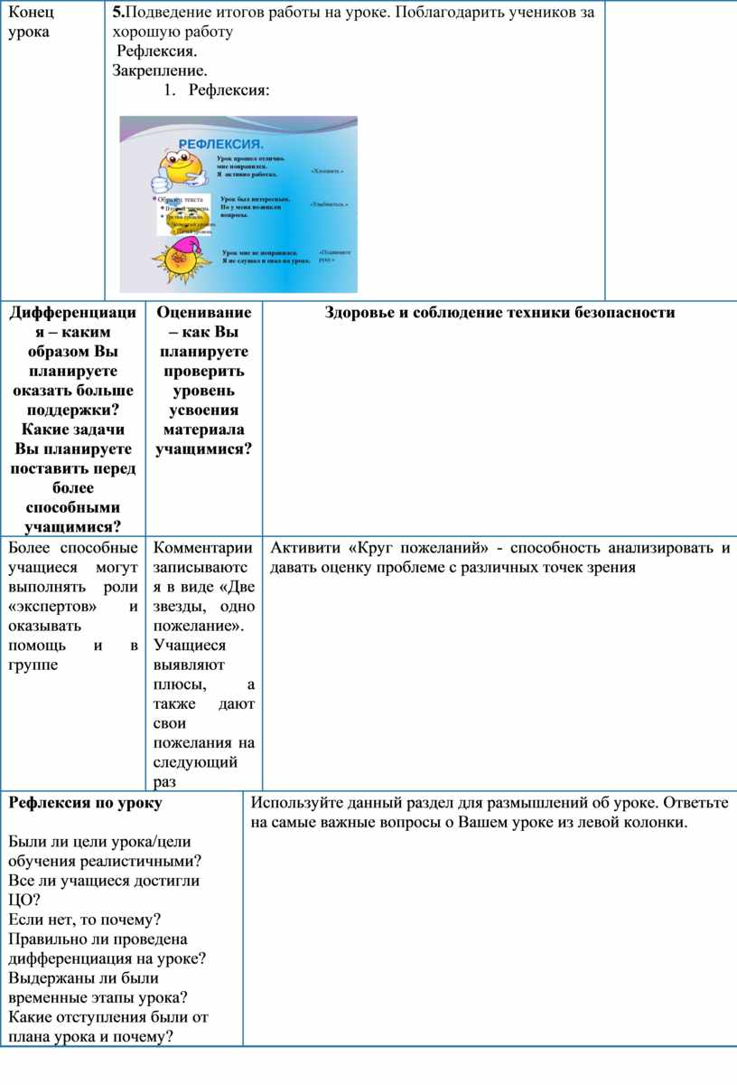 5.Подведение итогов работы на уроке. Поблагодарить учеников за хорошую работу Рефлексия. Закрепление. 1. Рефлексия: