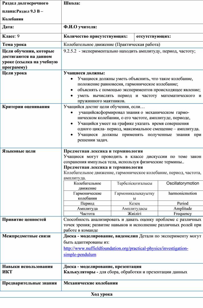 Раздел долгосрочного плана:Раздел 9.3 В – Колебания |