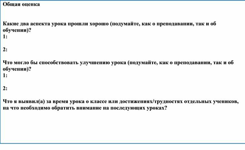 Используйте данный раздел для размышлений об уроке. Ответьте на самые важные вопросы о Вашем уроке из левой колонки. |