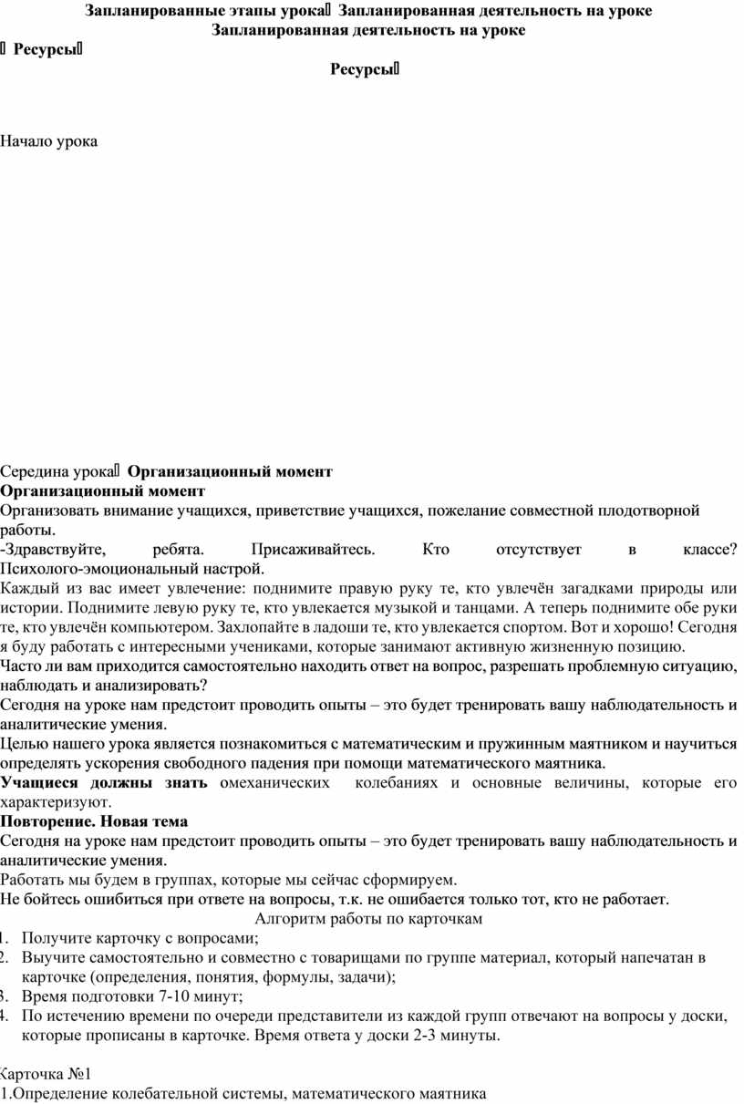 ребята. Присаживайтесь. Кто отсутствует в классе? Каждый из вас имеет увлечение: поднимите правую руку те, кто увлечён загадками природы или истории. Поднимите левую руку те, кто увлекается музыкой и танцами. А теперь поднимите обе руки те, кто увлечён компьютером. Захлопайте в ладоши те, кто увлекается спортом. Вот и хорошо! Сегодня я буду работать с интересными учениками, которые занимают активную жизненную позицию. Часто ли вам приходится самостоятельно находить ответ на вопрос, разрешать проблемную ситуацию, наблюдать и анализировать? Сегодня на уроке нам предстоит проводить опыты – это будет тренировать вашу наблюдательность и аналитические умения. Целью нашего урока является познакомиться с математическим и пружинным маятником и научиться определять ускорения свободного падения при помощи математического маятника. Учащиеся должны знать омеханических колебаниях и основные величины, которые его характеризуют. Повторение. Новая тема Сегодня на уроке нам предстоит проводить опыты – это будет тренировать вашу наблюдательность и аналитические умения. Работать мы будем в группах, которые мы сейчас сформируем. Не бойтесь ошибиться при ответе на вопросы, т.к. не ошибается только тот, кто не работает. Алгоритм работы по карточкам 1. Получите карточку с вопросами; 2. Выучите самостоятельно и совместно с товарищами по группе материал, который напечатан в карточке (определения, понятия, формулы, задачи); 3. Время подготовки 7-10 минут; 4. По истечению времени по очереди представители из каждой групп отвечают на вопросы у доски, которые прописаны в карточке. Время ответа у доски 2-3 минуты.