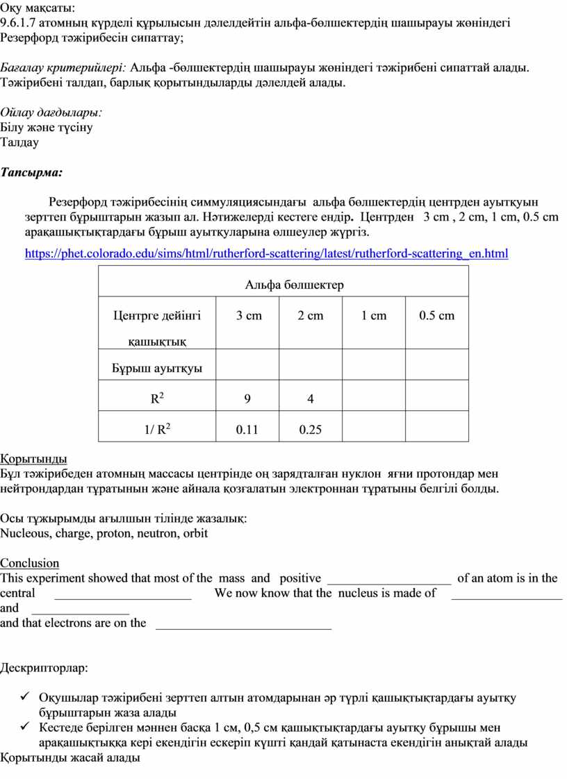 Бағалау критерийлері: Альфа -бөлшектердің шашырауы жөніндегі тәжірибені сипаттай алады. Тәжірибені талдап, барлық қорытындыларды дәлелдей алады.