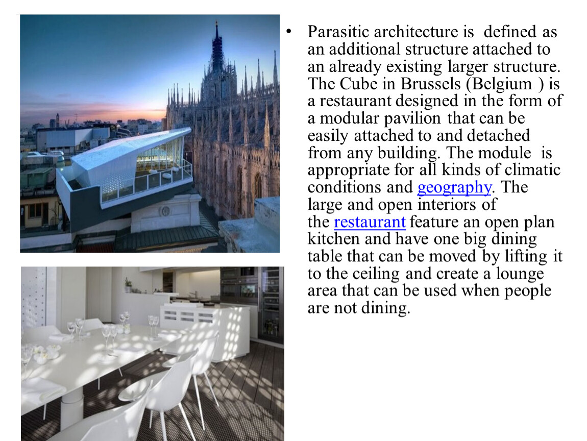Parasitic architecture is defined as an additional structure attached to an already existing larger structure. The Cube in Brussels (Belgium ) is a restaurant designed in the form of a modular pavilion that can be easily attached to and detached from any building. The module is appropriate for all kinds of climatic conditions and geography. The large and open interiors of the restaurant feature an open plan kitchen and have one big dining table that can be moved by lifting it to the ceiling and create a lounge area that can be used when people are not dining.